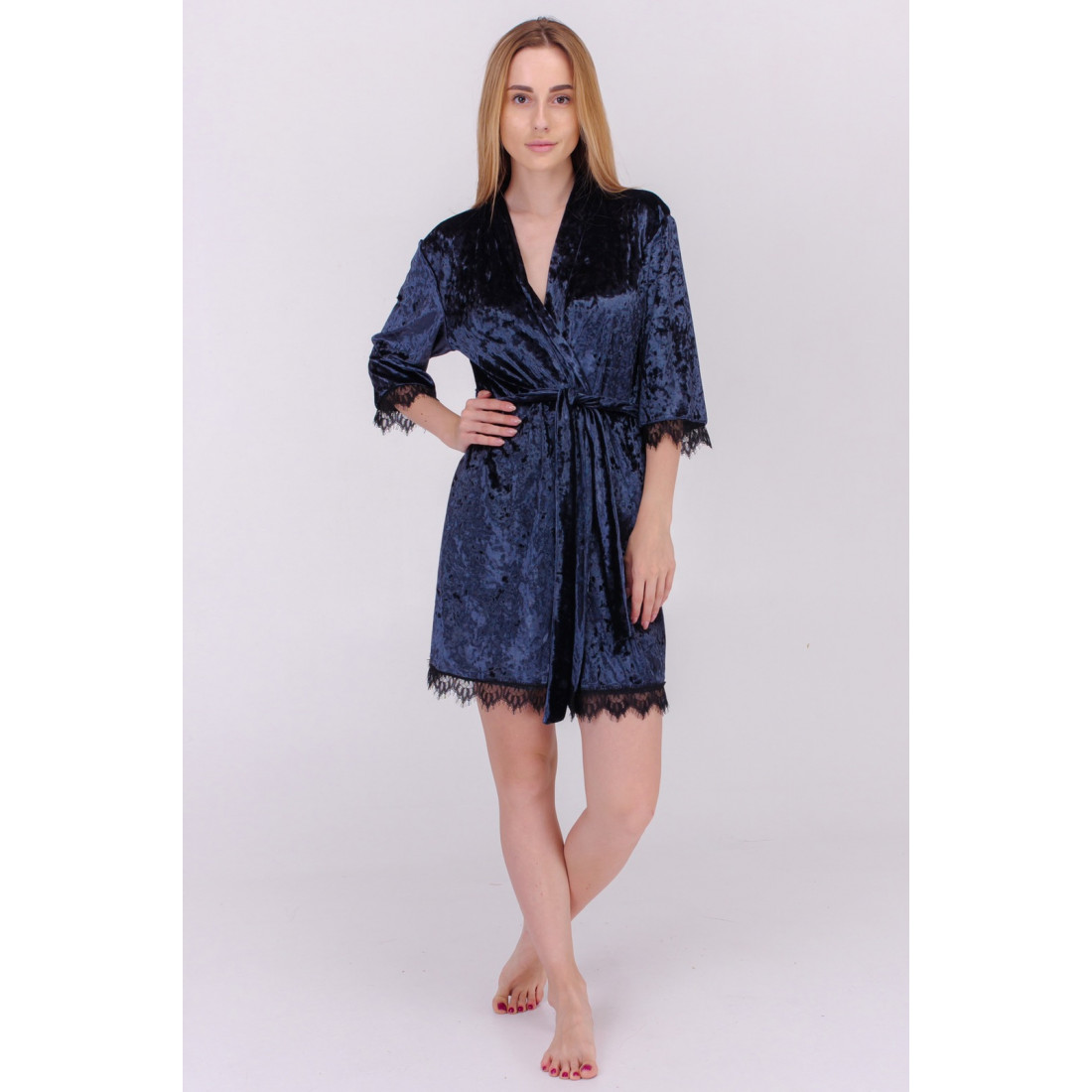 Жіночий короткий бархатний халат з мармурового велюру на запах з поясом, рукави 3/4,края виробу та рукави прикрашені мереживом