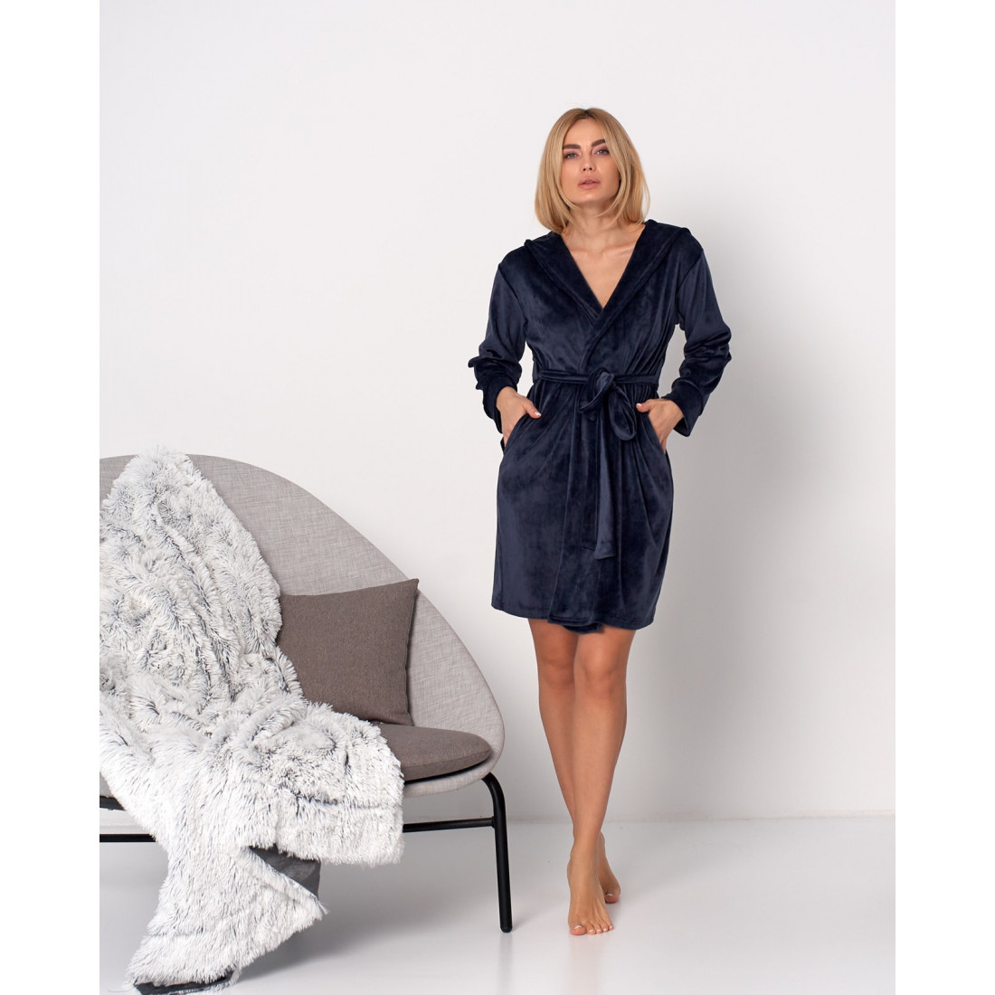 Жіночий короткий велюровий халат з капішоном та поясом на запах, довгі рукави.