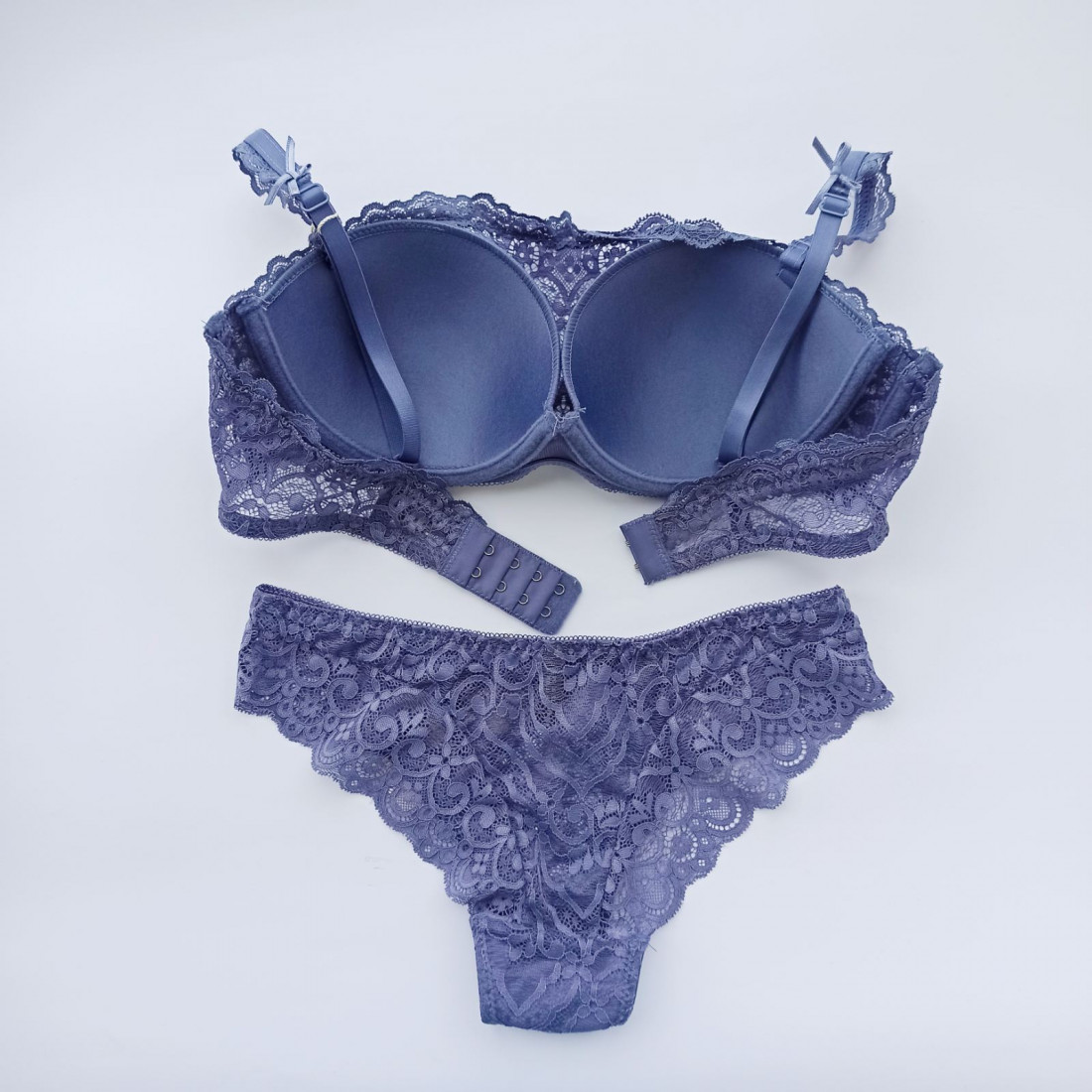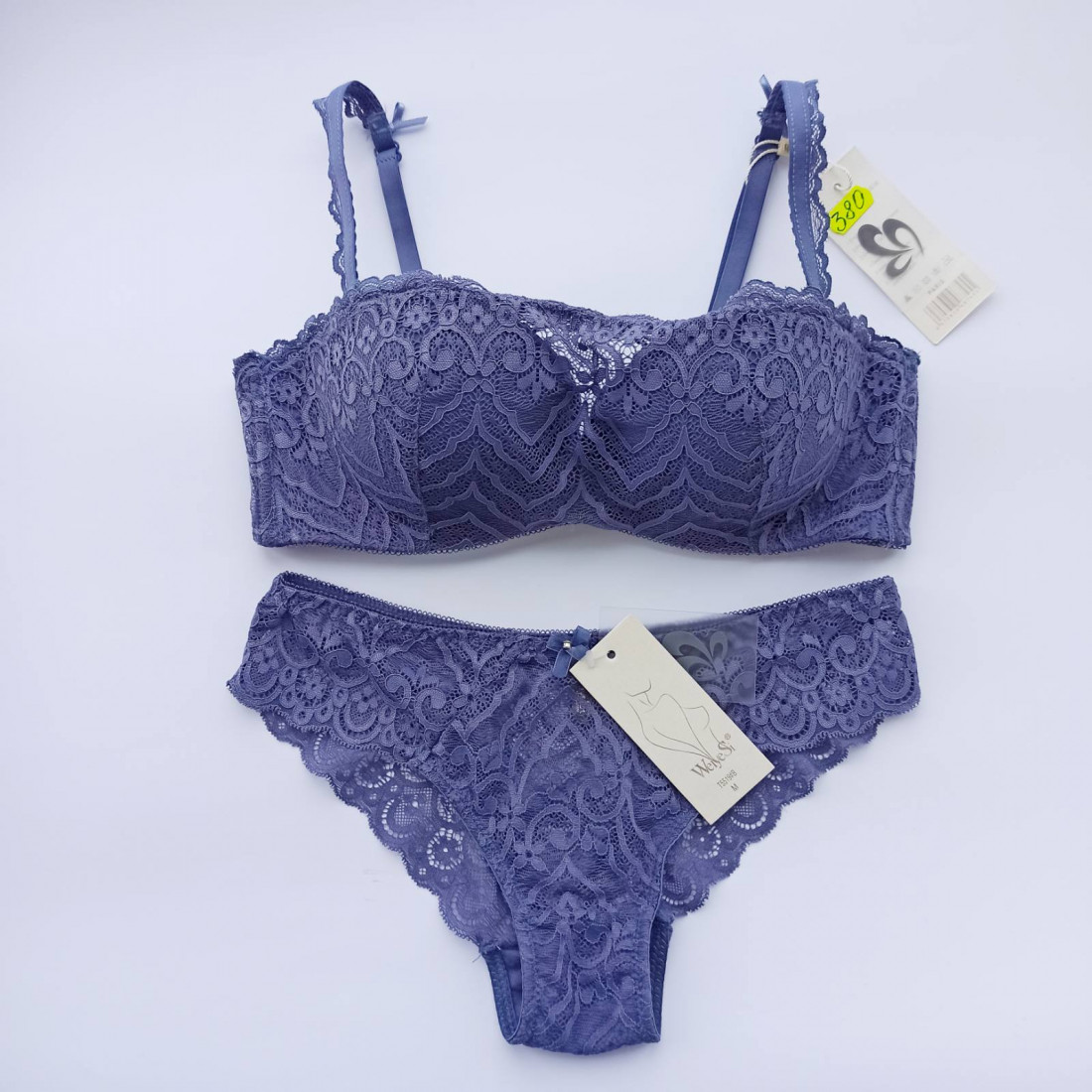 - бюстгальтер прикрашене мереживом на тонкому поролоні, створюється вигляд топа-бандо, знімні бретелі,спинка з мережива, застібка на чотири гачки в пдва рядки, спереду прикрашений мереживом та бантиком з підвіскою