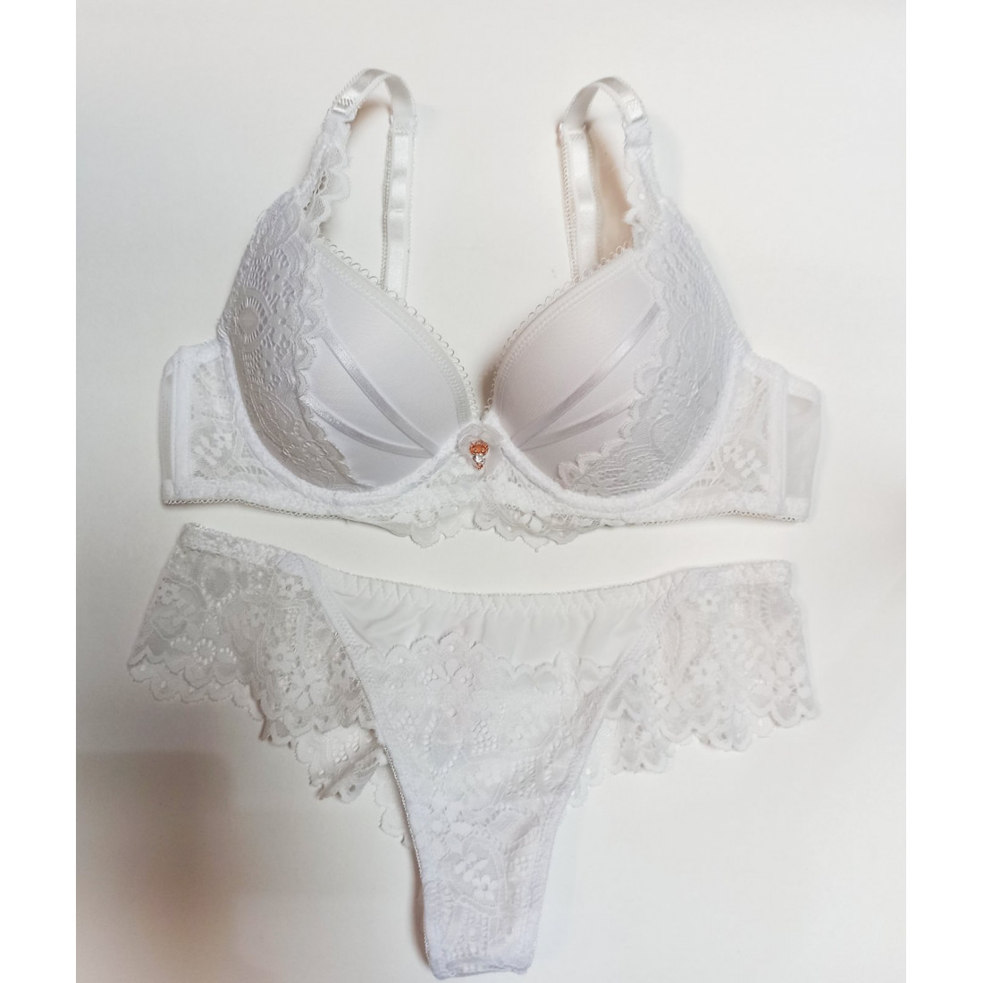 - бюстгальтер делікатно прикрашений мереживом формована чашка з пуш-апом, укріплений кісточками, знімні бретелі,спинка з сіточки, застібка на чотири гачки в один рядок, спереду прикрашений мереживом та бантиком з підвіскою совою.